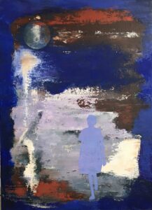 Après un travail à l’huile d’une dizaine d’années, centré sur la figure humaine, elle opte pour la peinture acrylique qui lui permet d’installer l’univers minéral qu’elle recherche.